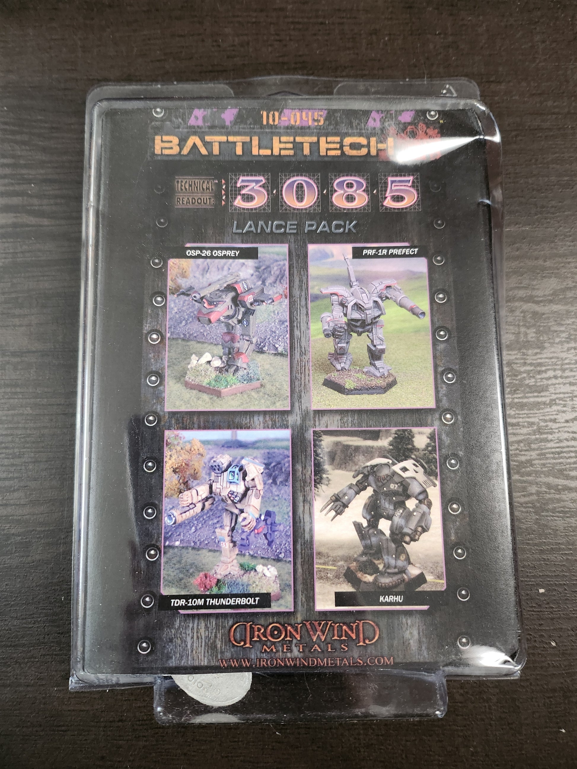 Supplied unassembled and unpainted. TRO 3085 Lance Pack (Includes Prefect, Thunderbolt, Karhu, Osprey Mechs)