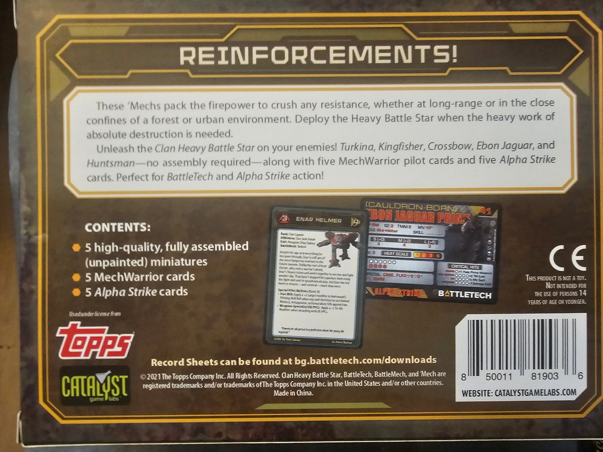 The Clan Heavy Battle Star is a collection of five plastic miniatures for use in the classic BattleTech tabletop and Alpha Strike games. The box also provides five dry-erase cards, which are intended to directly support Alpha Strike gameplay, and five new Clan Pilot Cards.