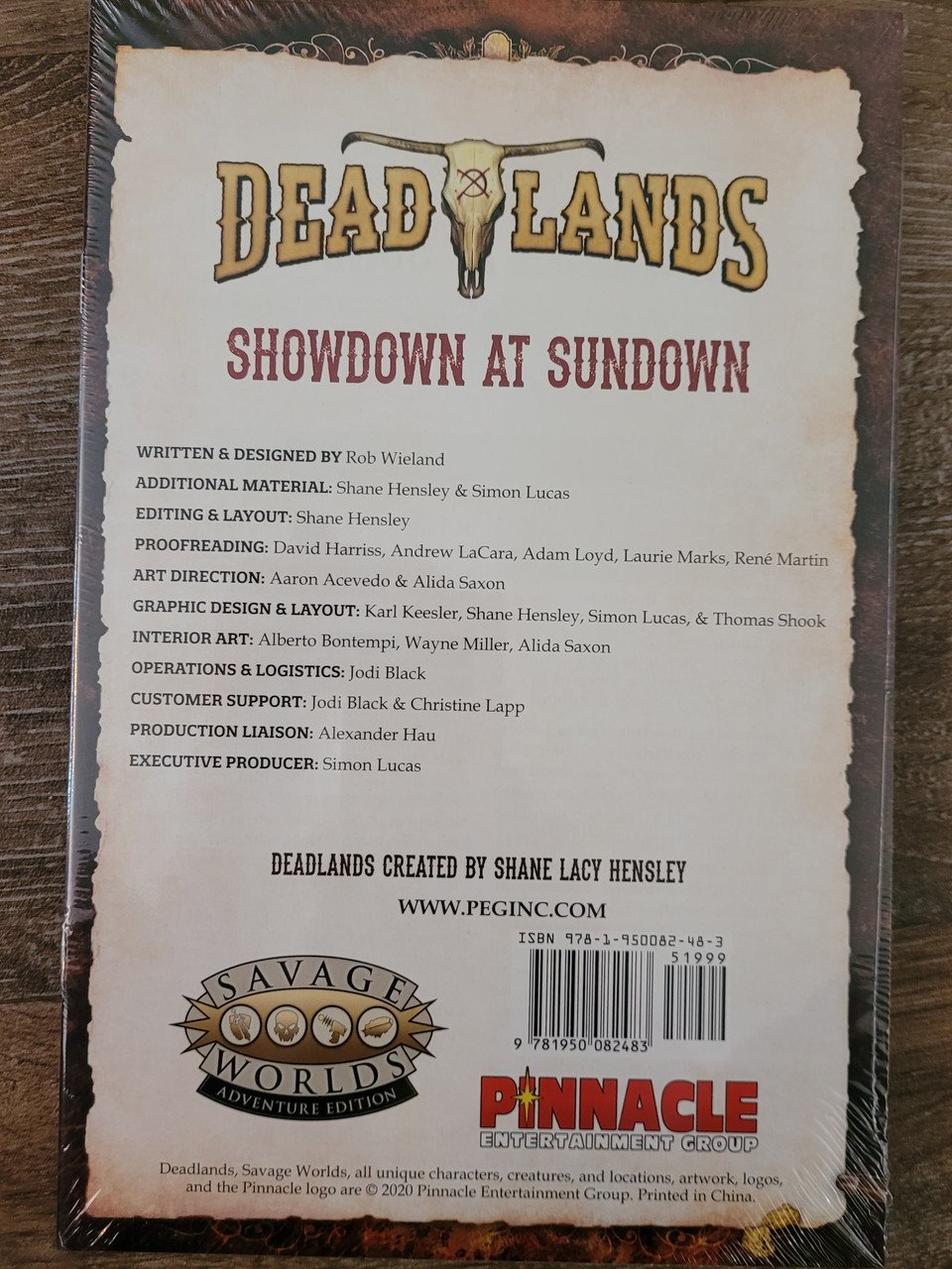 This gorgeous trifold screen contains a beautiful Deadlands image on one side and a whole host of useful charts and tables on the reverse. Also included is the 32 page adventure: Showdown at Sundown. This requires Savage Worlds core rules and Deadlands: the Weird West to play.