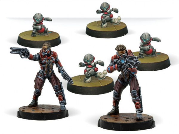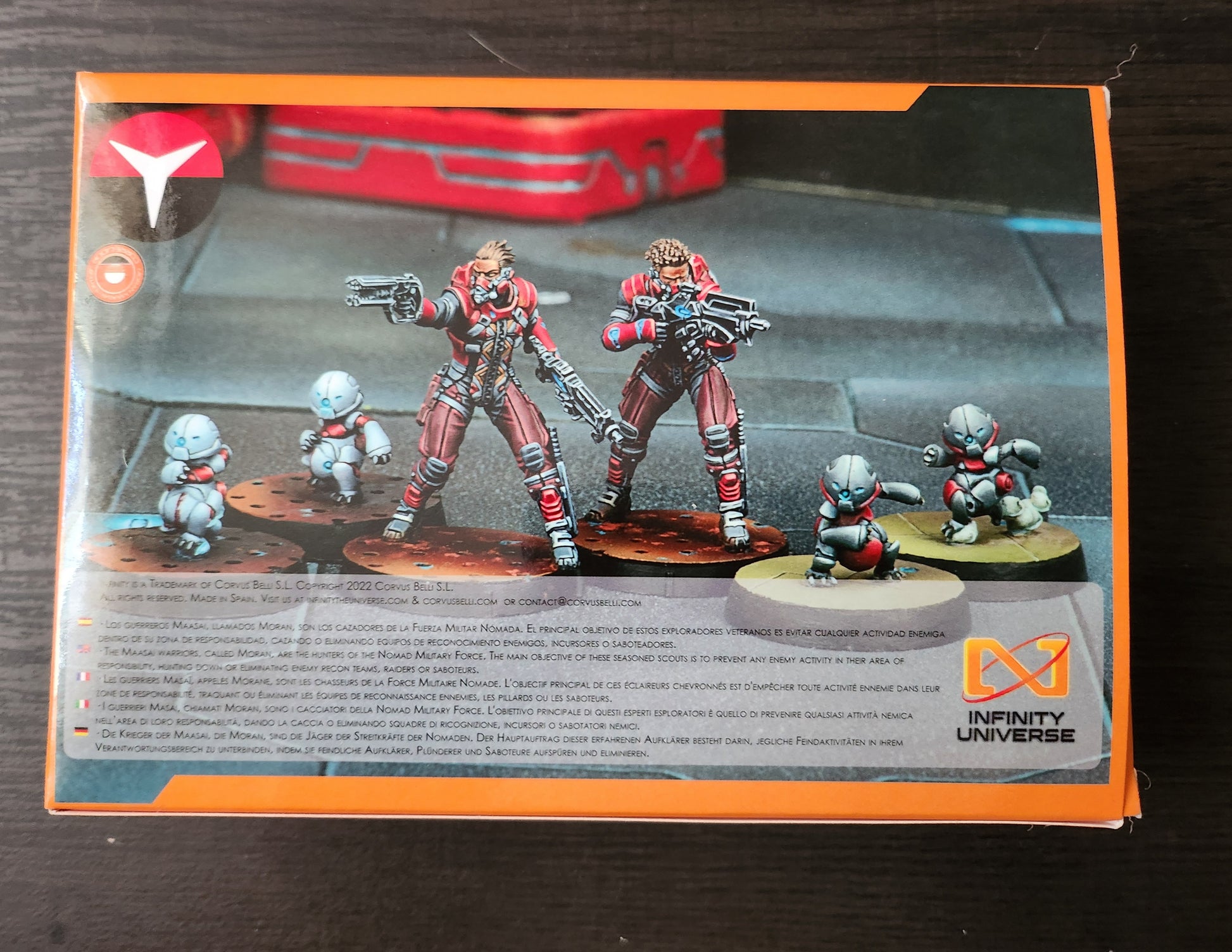 This box includes 6 miniatures: One Moran with Combi Rifle, one Moran with Boarding Shotgun and 4 CrazyKoalas. If you are looking for a powerful tabletop control, the Moran Maasai are the best choice. Their CrazyKoalas will frustrate the enemy advance and their Repeaters will extend the effect radius of your Hackers