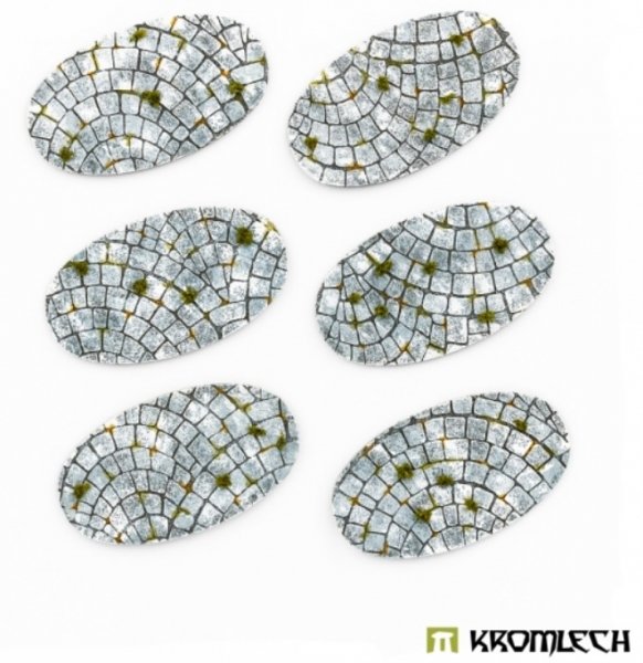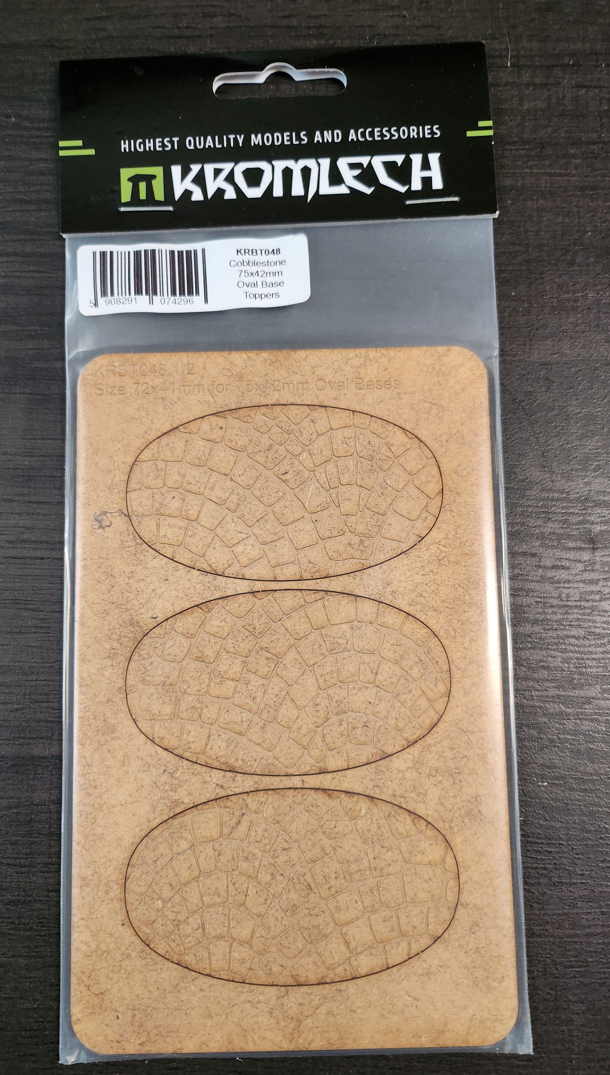 This set contains six oval 75 x 42mm base toppers with the Cobblestone theme - designed to fit the most popular grimdark fantasy game systems. It is a quick and easy way to add some unique character to your miniatures. Product is a lasercut from the high quality HDF board with fine details engraved.