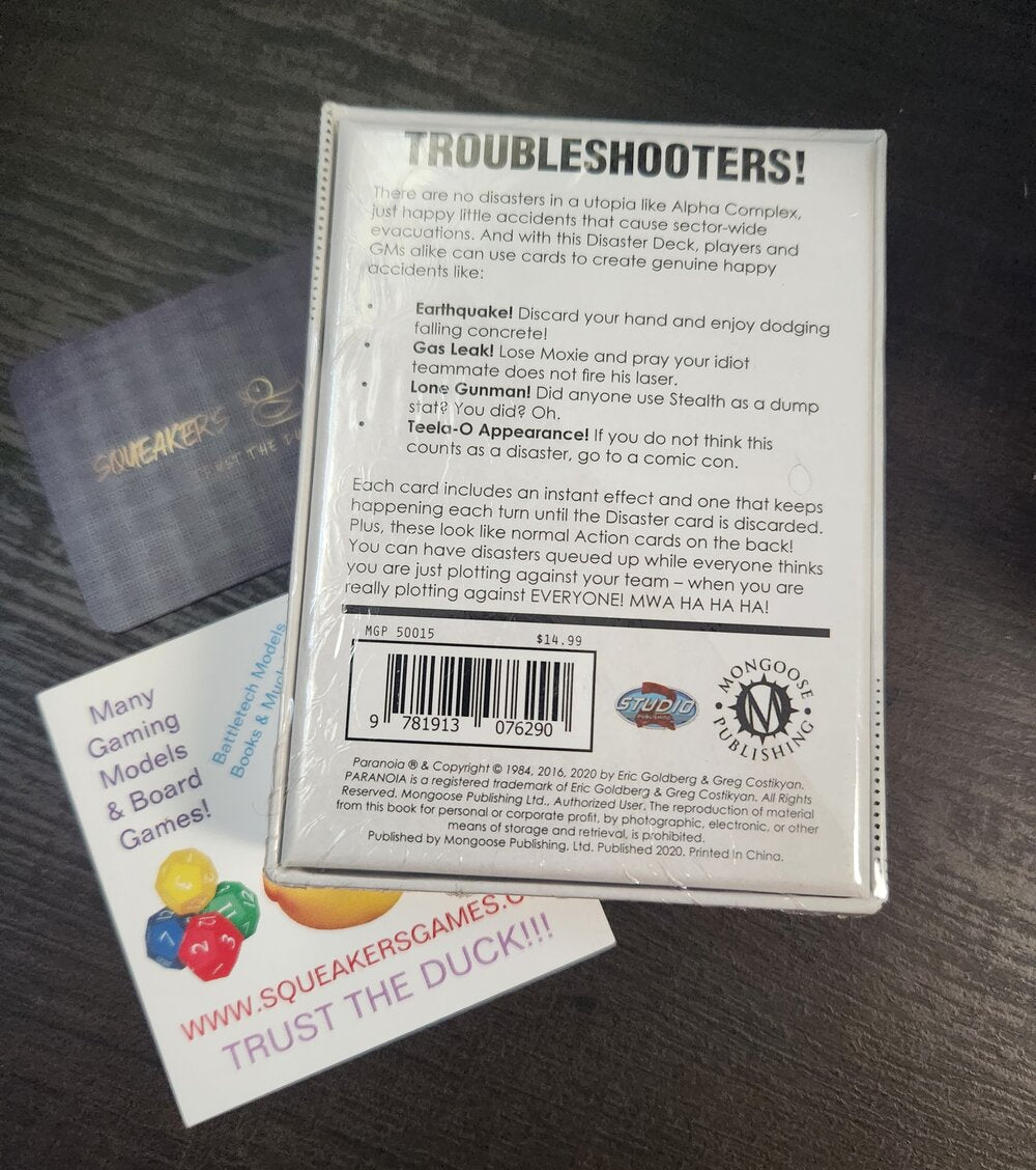 There are no disaters in a utopia likt Aplha Complex, just happy little accidents that cause sector-wdie evacuations.Each carde inculdes an istant effect and one that keeps happening each turn until the disaster card is discarded. Plus these like lok normal action cards on the back ! For GM’s and Players.