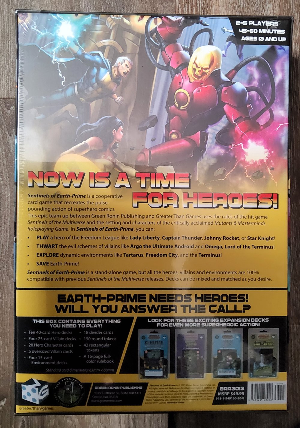 Sentinels of Earth-Prime is a cooperative card game that recreates the pulse pounding action of superhero comics. This epic team up between Green Ronin Publishing and Greater Than Games uses the rules of the hit game Sentinels of the Multiverse and the setting and characters of the critically acclaimed Mutants & Masterminds Roleplaying Game. Play a hero of the Freedom League like Lady Liberty, Captain Thunder, or Johnny Rocket striving against the schemes of villains like Argo the Ultimate Android and Omega, Lord of the Terminus, in dynamic environments like Tartarus and Freedom City. Sentinels of Earth-Prime is a stand-alone game but everything is 100% compatible with previous Sentinels of the Multiverse releases and decks can be mixed and matched as you desire. The game includes 18 card decks (ten heroes, four villains, and four environments), as well as tokens, dividers, and a rulebook.