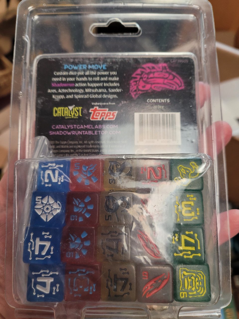 This custom collection of dice bears the markings of some of Shadowrun’s most powerful corps. With special corporate logos accompanying the 5s and 6s, a glitch mark on the 1, and an assortment of colors, these dice enhance any Shadowrun game–and make it easy to pick out one to use as the wild die! (20 dice total)