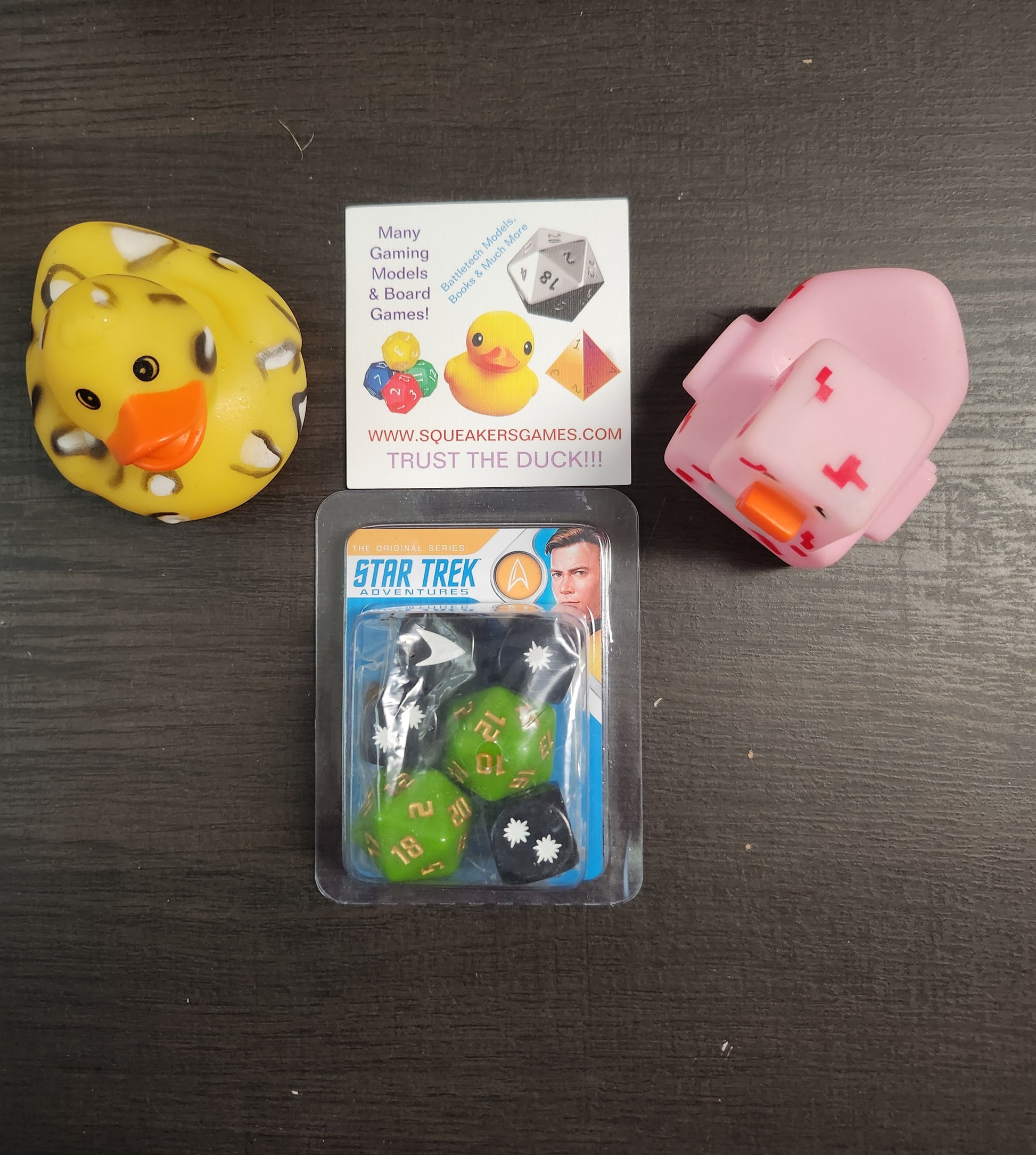 - Two twenty-sided dice with a custom captain’s tunic design, and four six-sided Challenge Dice for use with Star Trek Adventures.