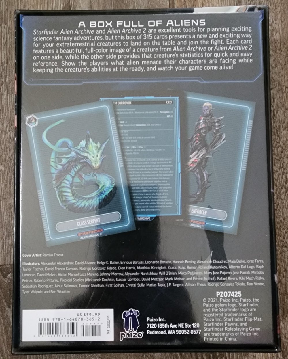 Keep the aliens of the Starfinder RPG close at hand with this massive collection of over 200 reference cards featuring every extraterrestrial creature from Starfinder Alien Archive and Alien Archive 2! Each 4 x 6 card is printed on sturdy cardstock and features a beautiful, full color image of a Starfinder creature on one side, while the other side provides that creatures statistics for quick and easy reference.