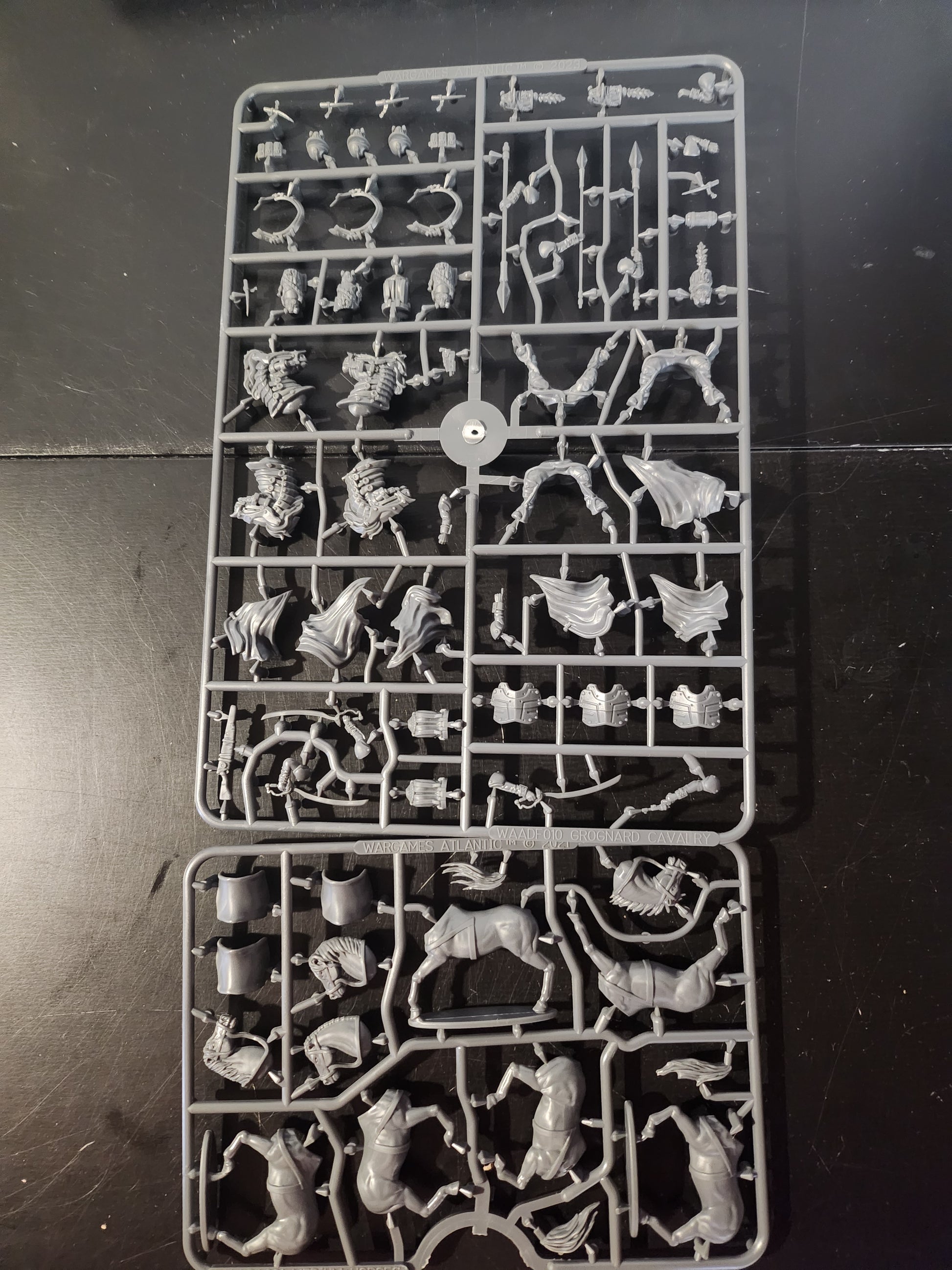 plastic cavalry that can be equipped with lance, pistol, or sword. Horses can be built plain or with armored heads, chests, and caparisons. Three types of gas-masked headgear will create different styles of rider. And of course all parts are compatible with other Les Grognards plastic sets.