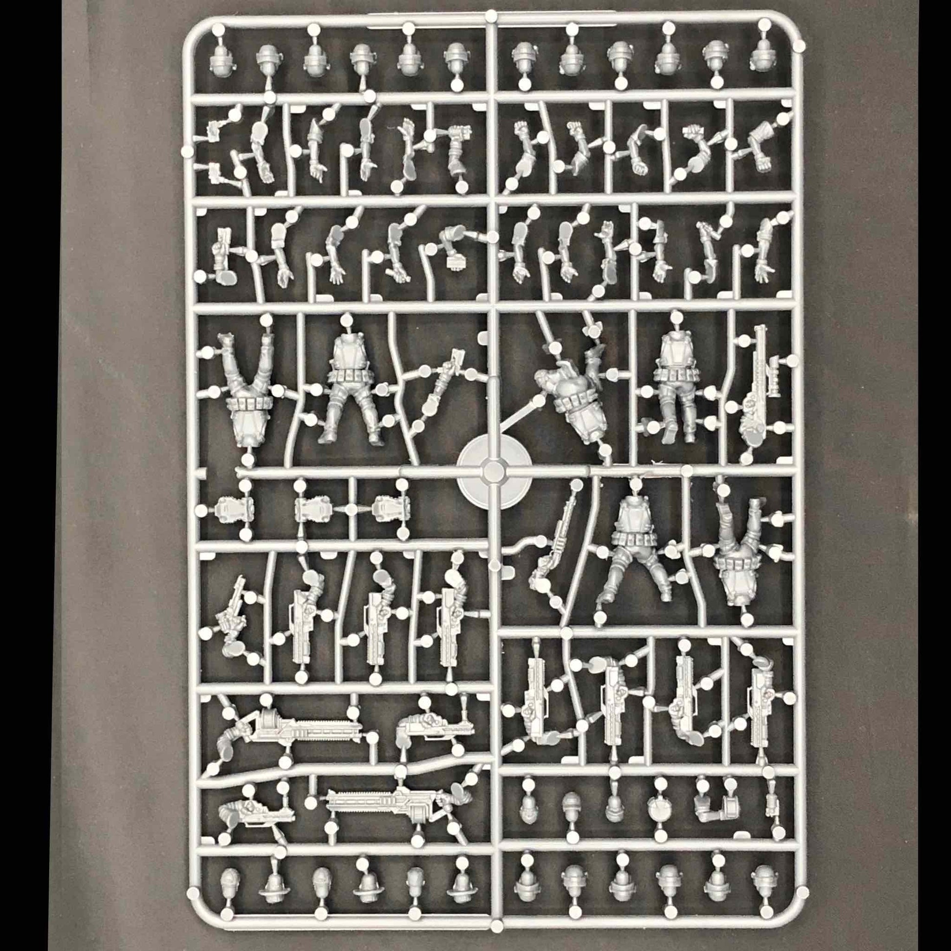 Hard plastic soldiers that can be equipped with standard infantry rifles with underslung shotgun/grenade launcher, carbines, sniper rifle, pistols, shotgun, flame unit, and squad support weapons. Five headgear choices allow you to customize your forces.