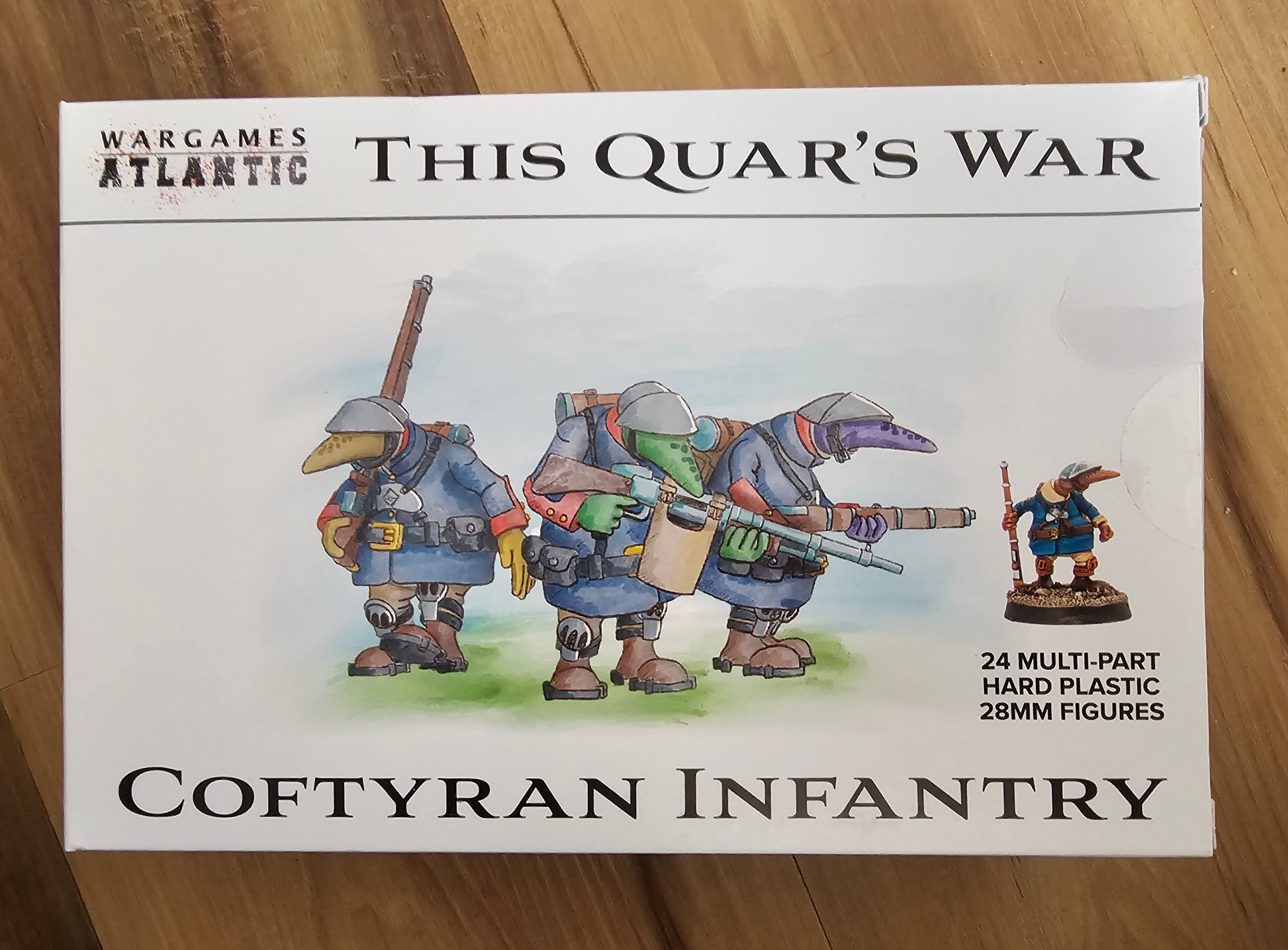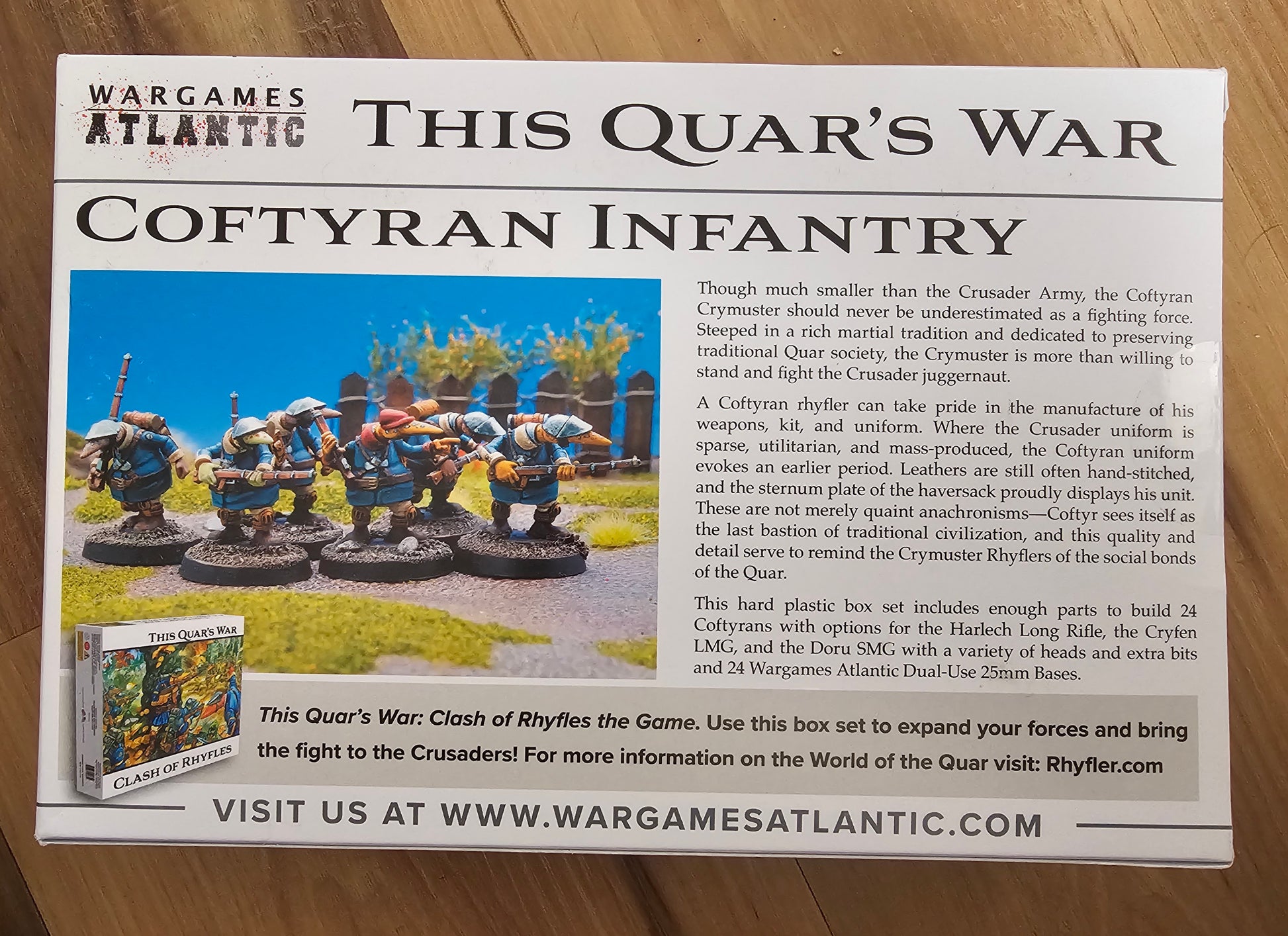 This hard plastic box set includes enough parts to build 24 Coftyrans with options for the Harlech Long Rifle, the Cryfen LMG, and the Doru SMG with a variety of heads and extra bits and 24 Wargames Atlantic Dual-Use 25mm Bases.