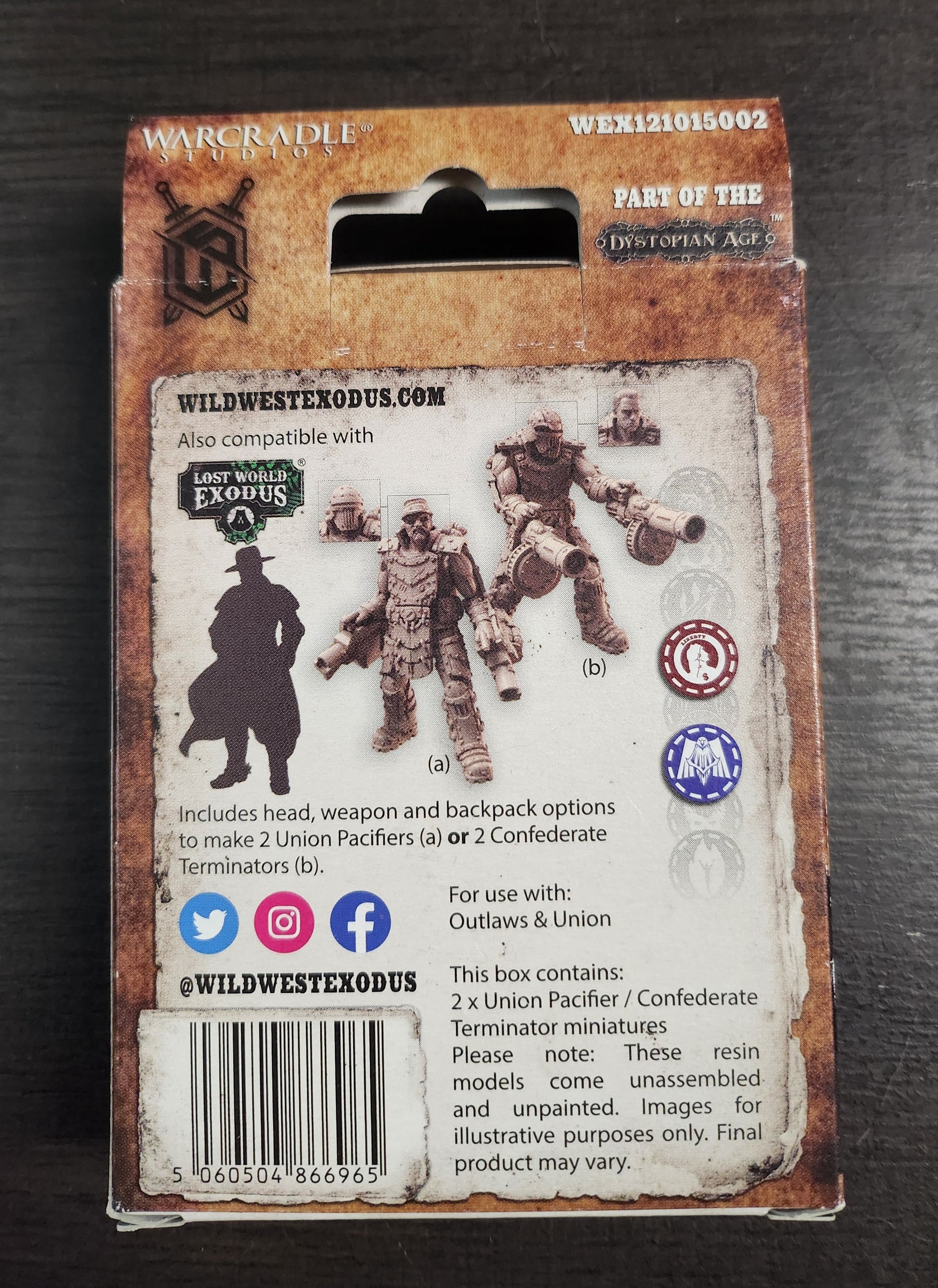 Includes head, weapon and backpack options to make 2 Union Pacifiers or 2 Confederate Terminators.